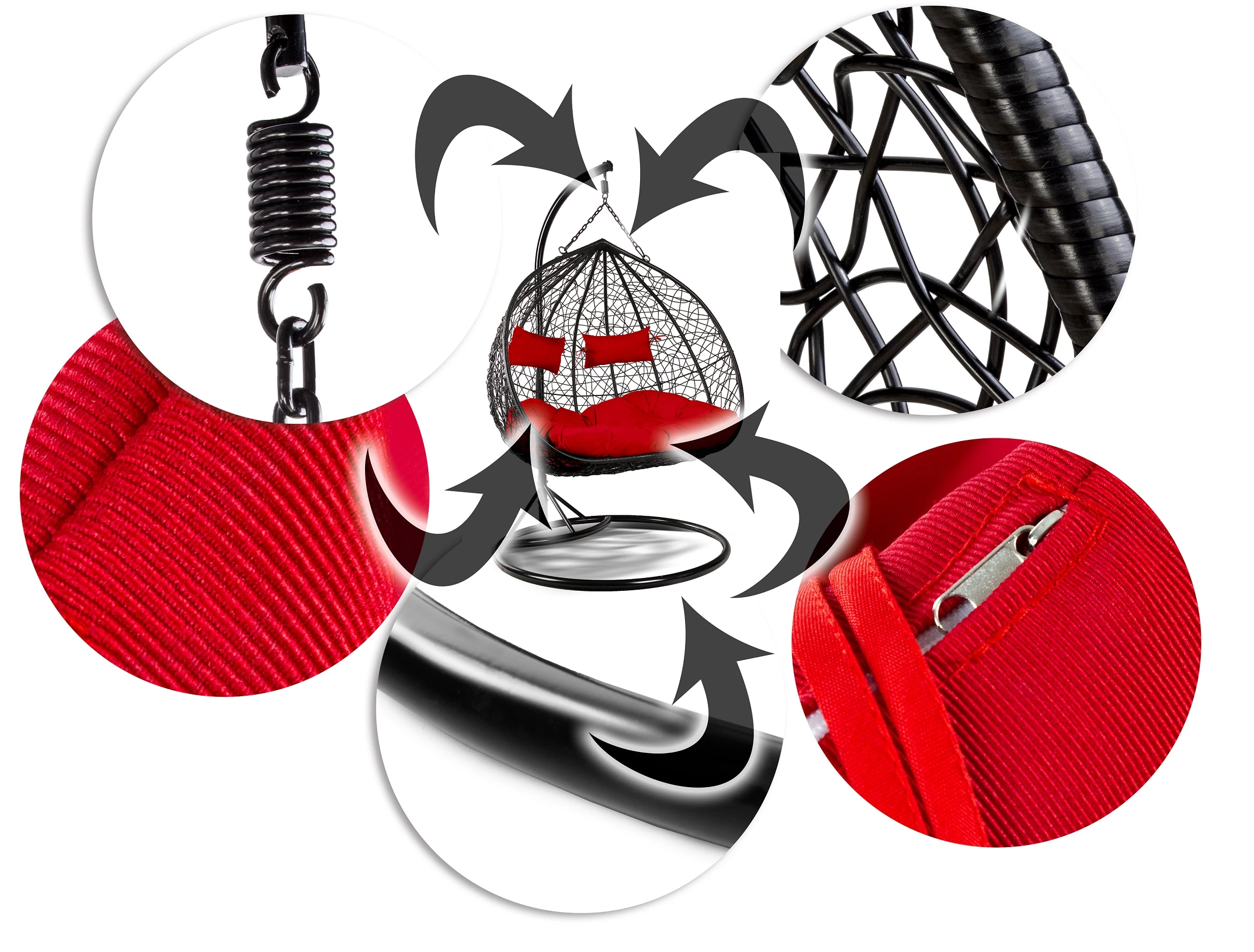 - w zestawie – stelaż (czarny), kosz (czarny), haki, duża poducha na siedzisko i 2 wiązane na zagówek