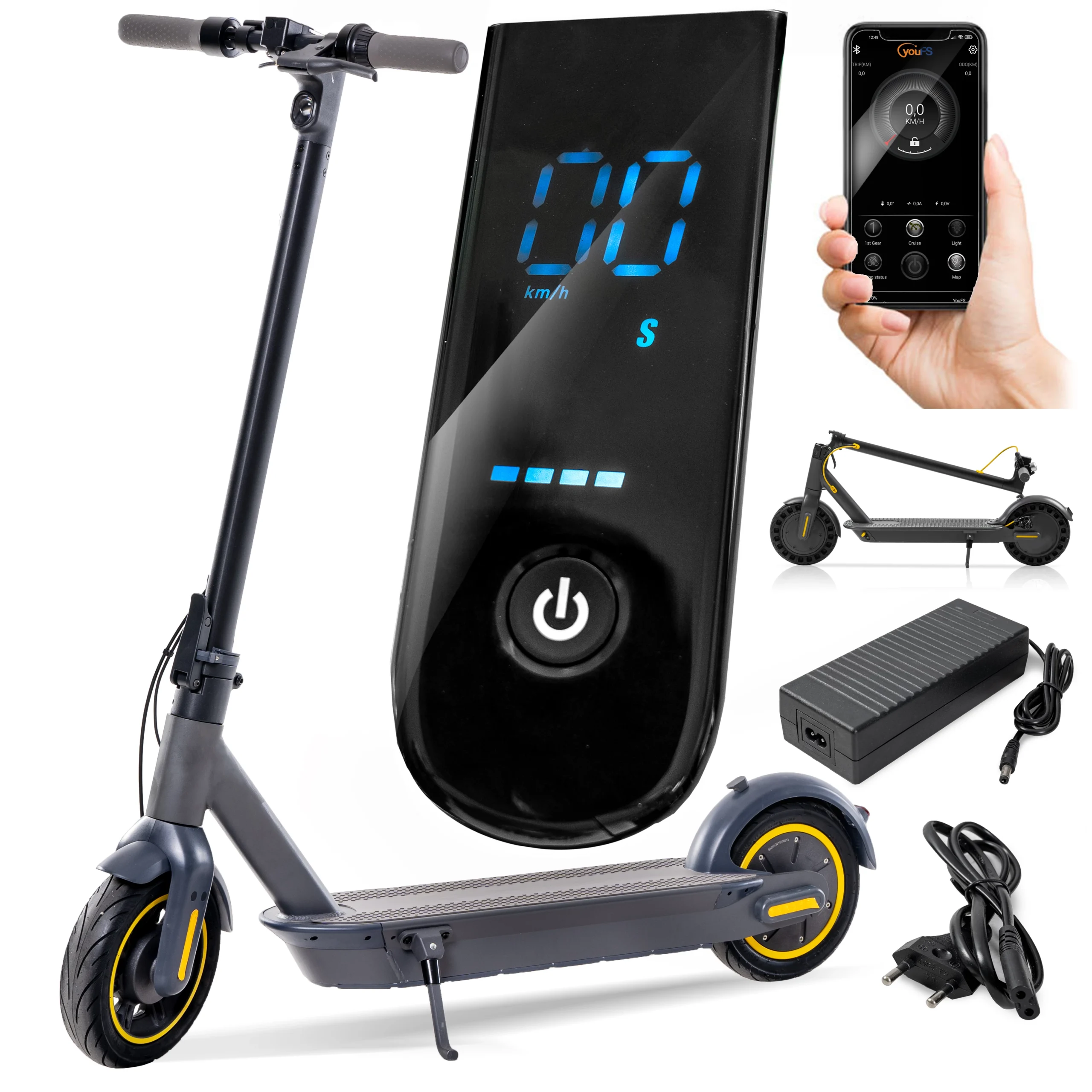Trzy tryby prędkości ECO tryb oszczędzania energii D tryb standardowy S tryb sportowy Ekran LCD Na czytelnym wyświetlaczu możesz sprawdzać prędkość dystans oraz zasięg hulajnogi podczas jazdy.