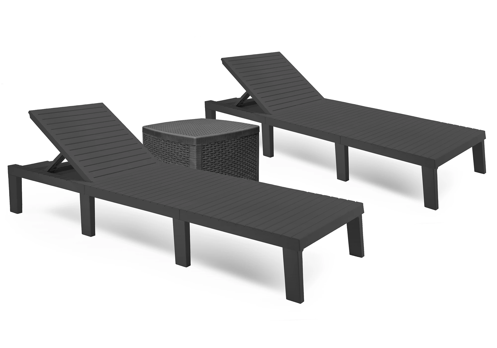 - Ilość sztuk w zestawie – 2 sztuki leżaków plus stolik (box)-w formie schowka na ręczniki bądź poduszki