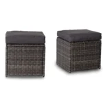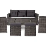 - W zestawie – 1 stół, sofa-3os, 2 fotele, 2 pufy i zestaw poduszek na siedzisko i oparcie.