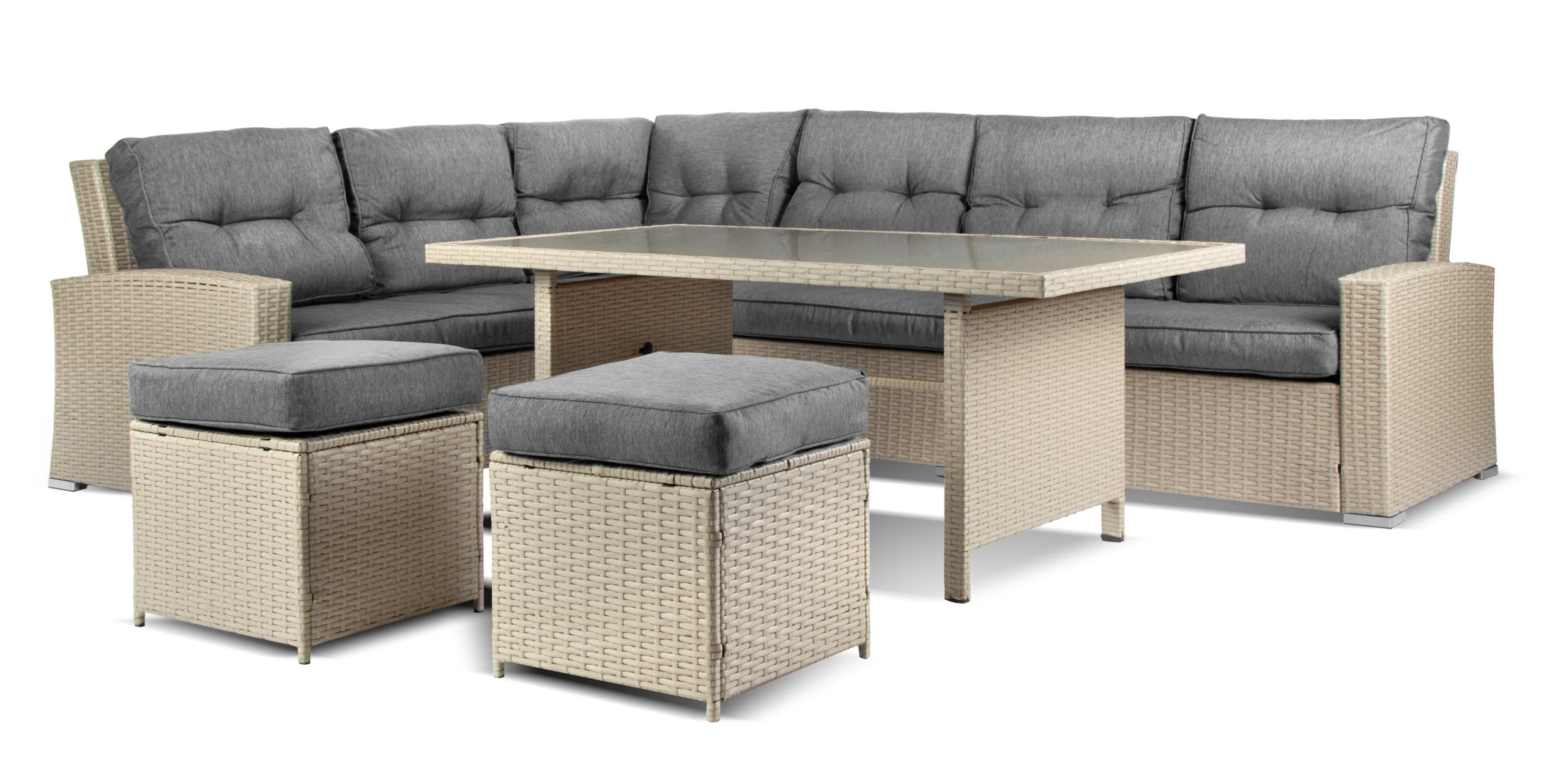 - W zestawie – 1 stół, narożnik 2-częściowy, 2 pufy, zestaw poduszek na siedzisko i oparcie.