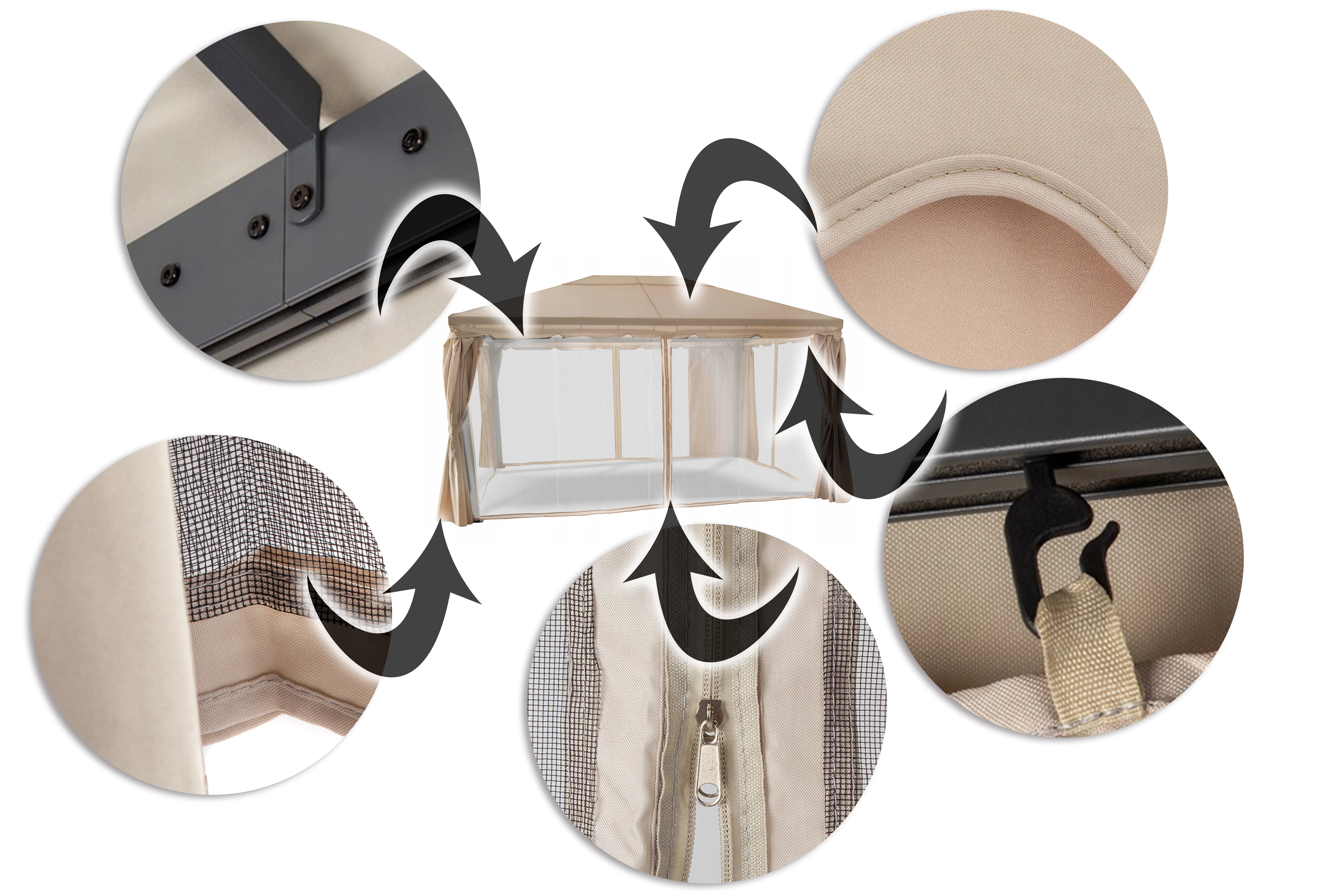 Altana została zaprojektowana z myślą o najnowszych trendach w aranżacji ogrodowej. Jej nowoczesny design stanowią ażurowa, stalowa konstrukcja oraz subtelne zasłony. Materiały są bardzo wytrzymałe i stabilne. Oryginalne wzornictwo zostało podkreślone stonowanymi kolorami, które świetnie komponują się w ogrodzie oraz na tarasie.