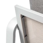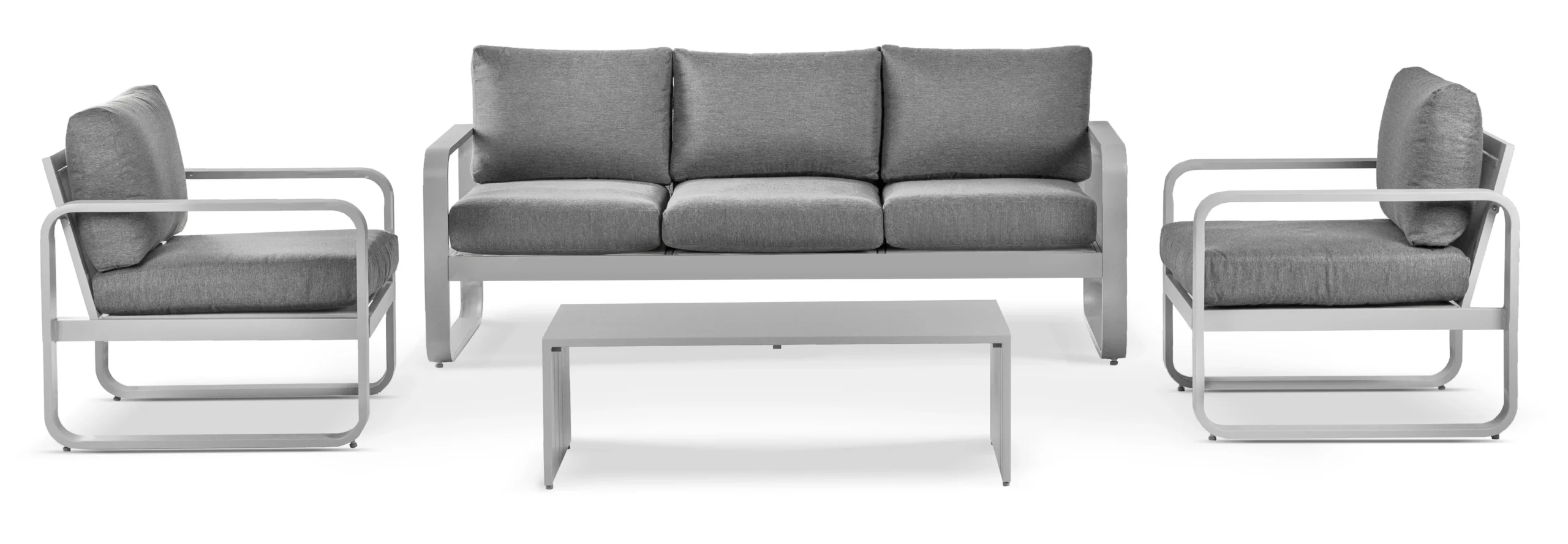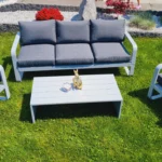 Zestaw składa się z sofy 3-sobowej, 2 foteli i stolika kawowego z modnego materiału bardzo lekkiego aluminium wraz z poduszkami poliestrowymi. Zestaw jest hitem sezonu wiosna – lato i niezastąpionym zestawem wypoczynkowym do balkonu czy słonecznego tarasu.