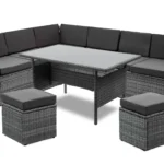 - Ilość elementów zestawu – 5 : 1 narożnik, 2 pufy, stół, poduszki