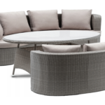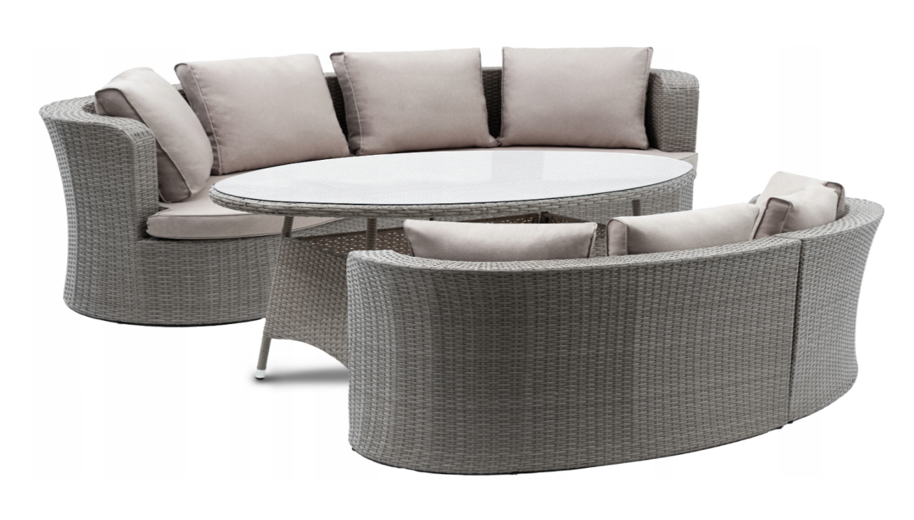 Zestaw SOLDEN© składa się ze stołu ze szklanym blatem, 4 sof, które można połączyć w dwie większe sofy oraz zestawu poduszek na siedzisko jak i oparcie. Meble wyróżniają się nowoczesnym wzornictwem w aranżacji ogrodów. Świetnie się komponują się w wymarzonym wnętrzu ogrodowym oraz na słonecznym tarasie.