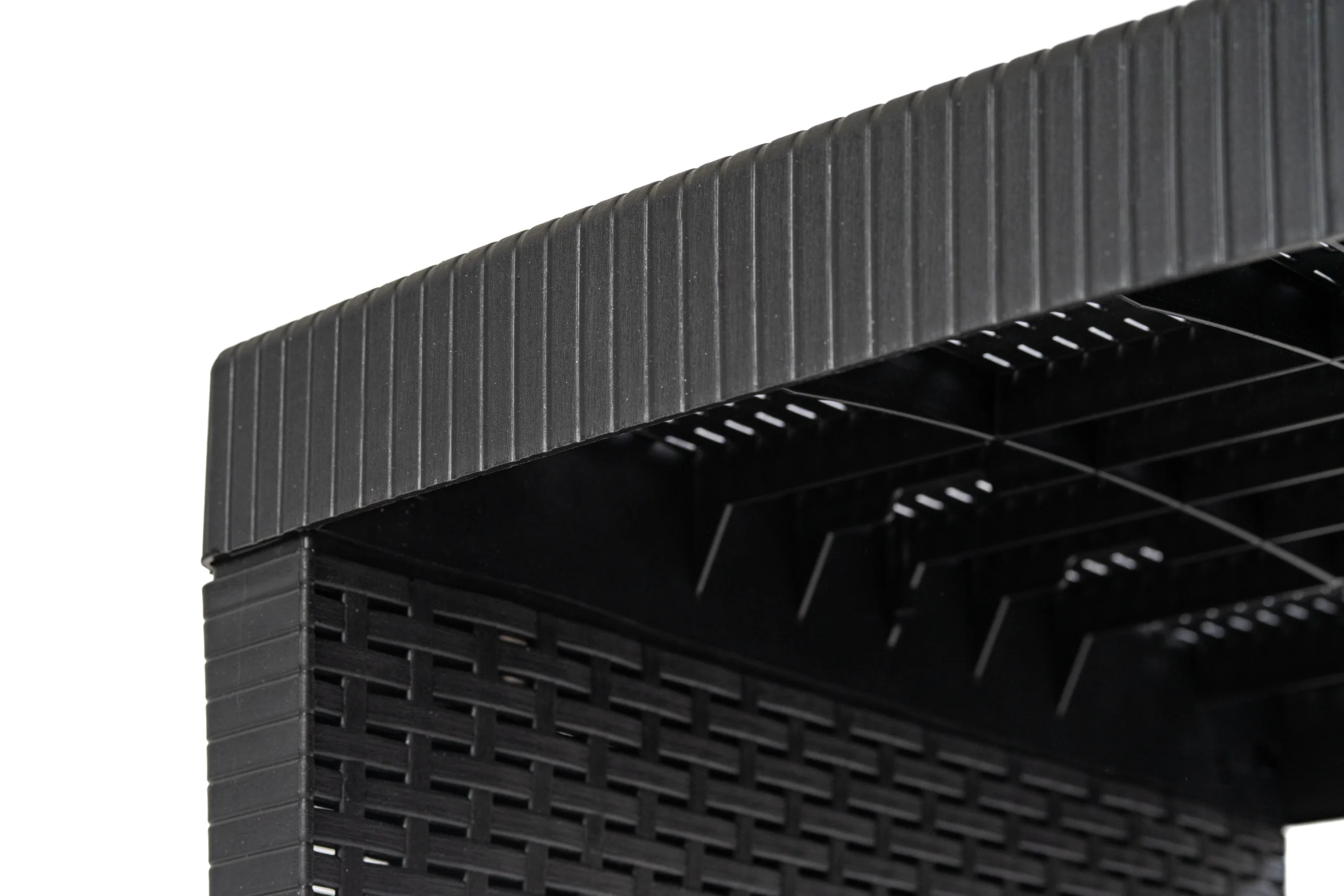 Zestaw sprawdzi się w wielu aranżacjach. Aby zachować nieskazitelną trwałość materiałów, meble należy umieścić pod zadaszeniem.
